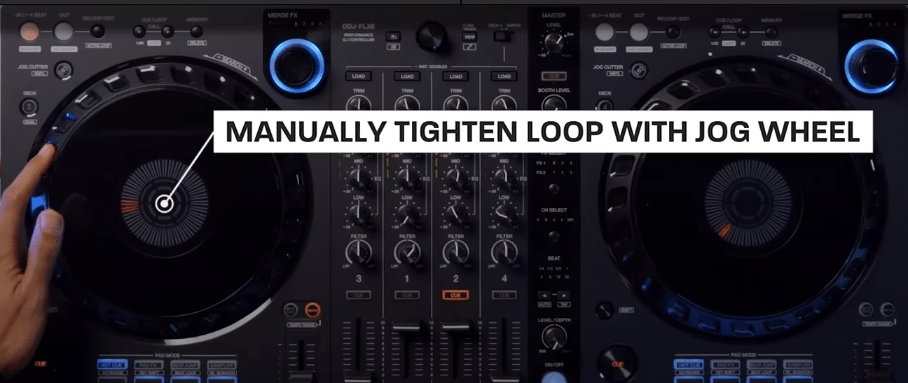 MANUALLY TIGHTEN LOOP WITH JOG WHEEL: Manually tighten the 212 loop by gently nudging the jog wheel on Deck A, so the vocal becomes partially cut off.