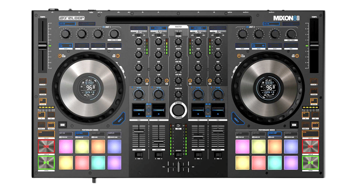 The Reloop Mixon 8 Pro is a versatile 4-channel DJ controller that’s designed to work with both Serato DJ Pro and Algoriddim’s djay Pro software – it even comes with a built in stand to hold a iPad. It also offers basically every connectivity option you’d want, including four external inputs (two switchable between line and phono), dual microphone inputs with talkover functionality, and balanced XLR master outputs.