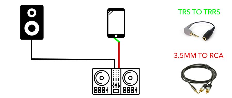 - Plug the RCA to 3.5mm cable into the output of your controller. If your controller has a REC OUT or MASTER TWO output use this. If the controller only has one output, purchase RCA Splitters and split the audio between your speakers and the RCA to 3.5mm cable which will go to the phone.