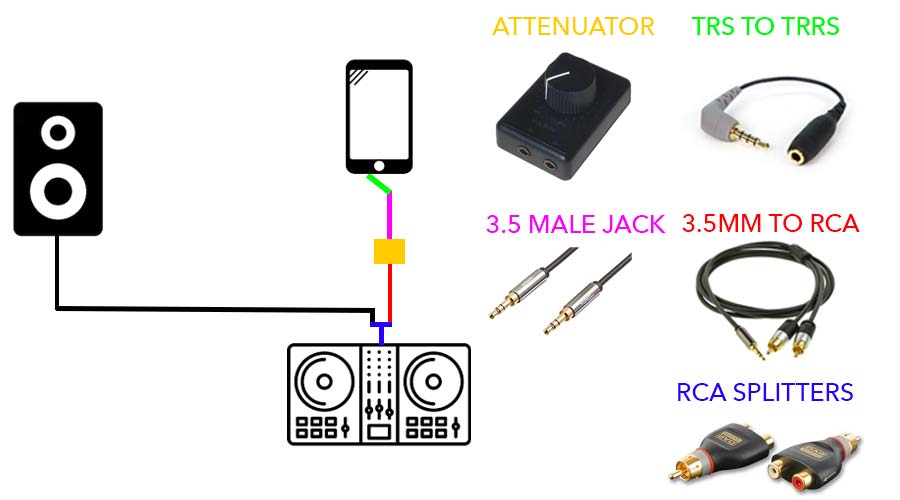 - Plug the RCA to 3.5mm into the Attenuator. DJ equipment outputs at line level volume, unfortunately your phone is expecting a mic level input. The attenuator allows the user to reduce the volume down to Mic level to avoid distortion and clipping. You can skip the attenuator but you will need to set your output levels on your controller very low!