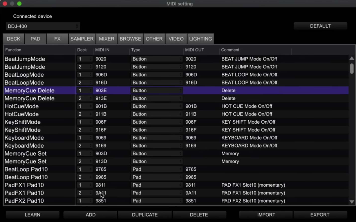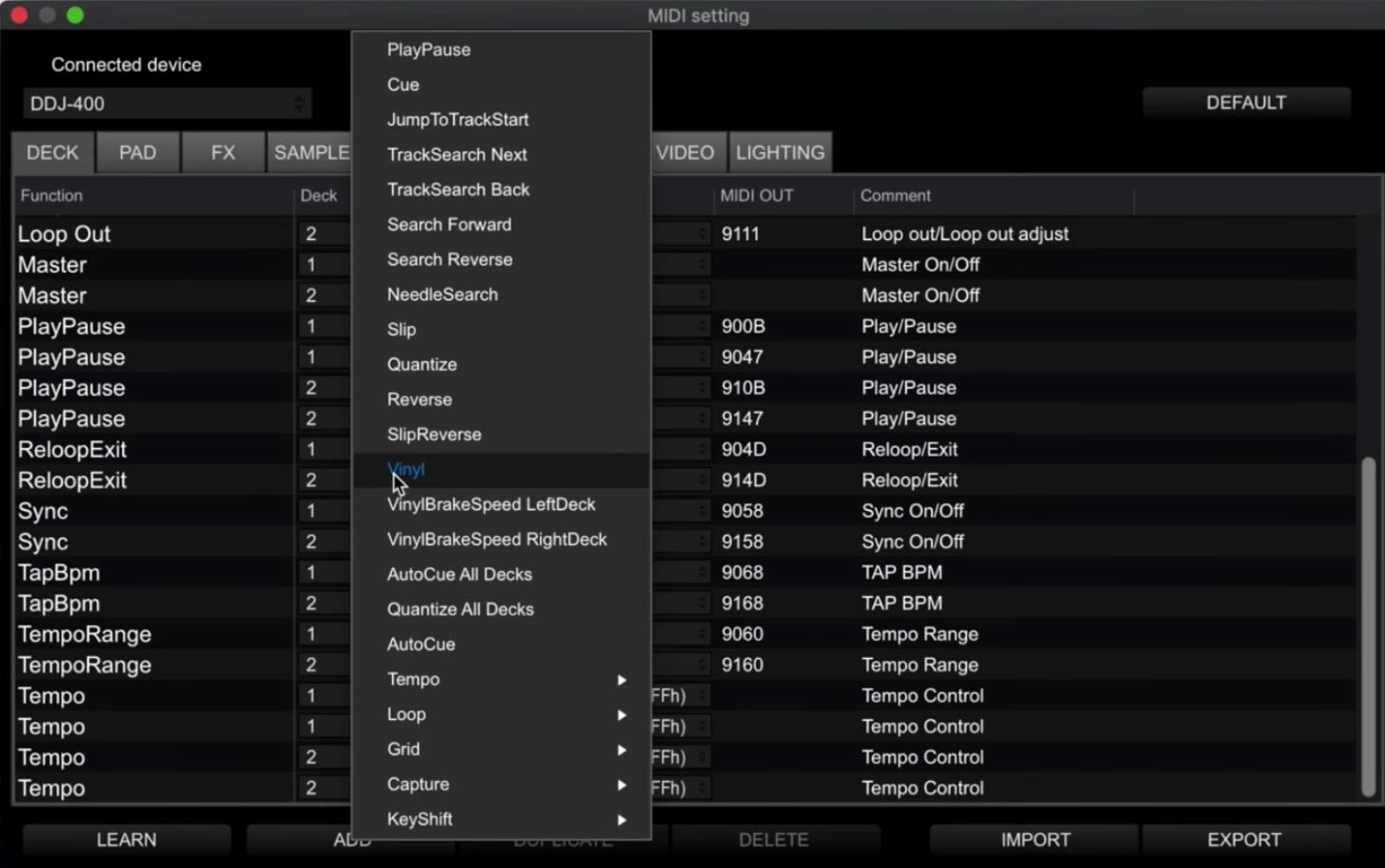 Rather than following the tutorial below, you can download the file from the link below. To use this map file, click MIDI when the DDJ-400 is installed and press IMPORT in the bottom right corner. Then navigate to the download to load it. The vinyl button will now be mapped to the Memory Delete button as per the tutorial below.