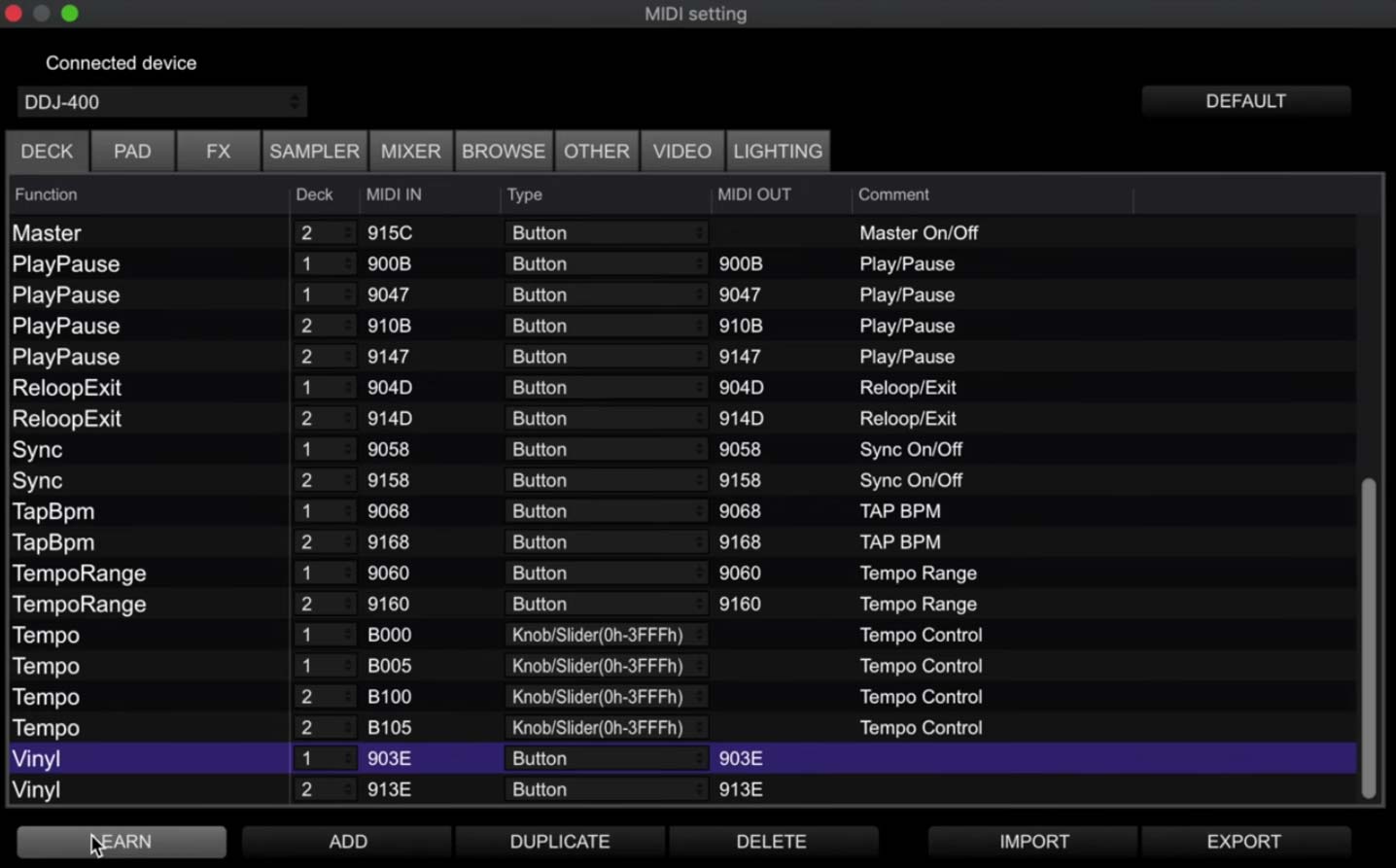 The software will automatically add the code in. Repeat for each deck and your MIDI mapping should now look like this.