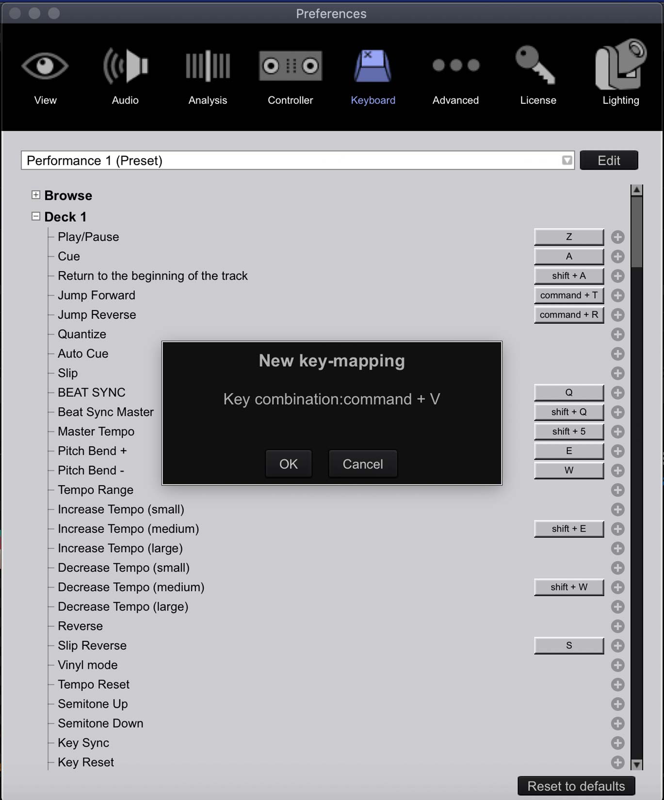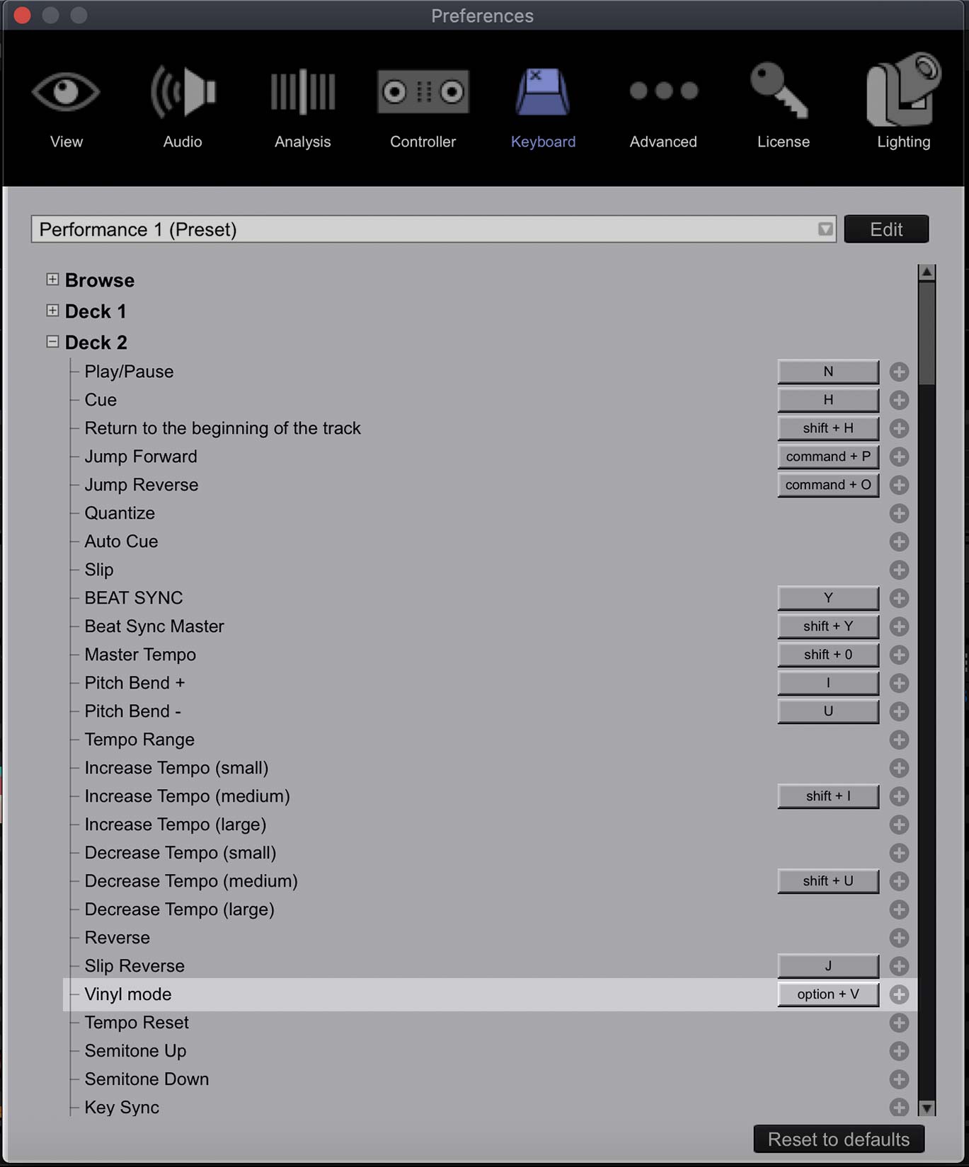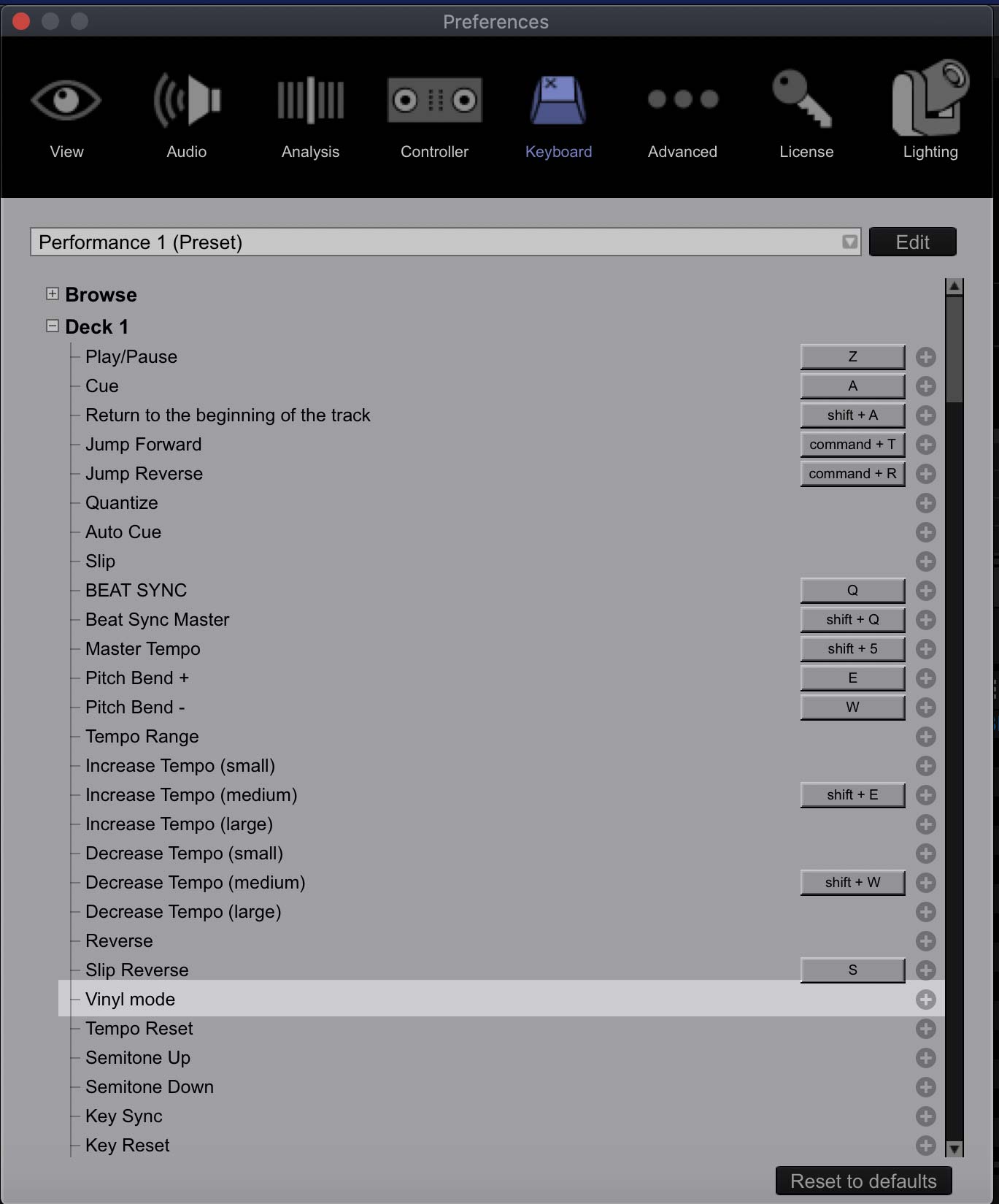 In the Keyboard section, open deck one and scroll down to Vinyl Mode. You’ll see no shortcut has been assigned.
